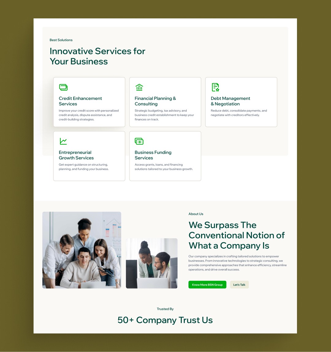BSN Group Inc is a professional consulting firm that provides tailored financial advisory, debt resolution, and business growth services for small to mid-sized enterprises. Their core mission is to empower businesses through strategic support, innovative funding solutions, and clear financial guidance.