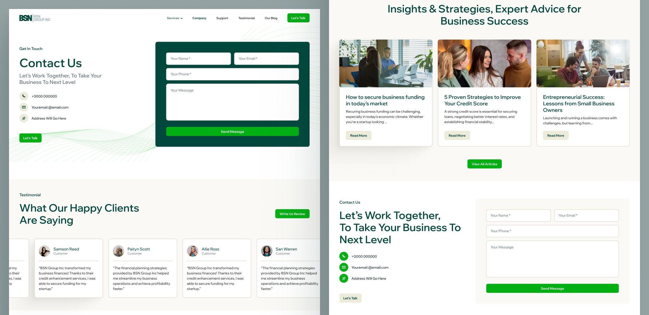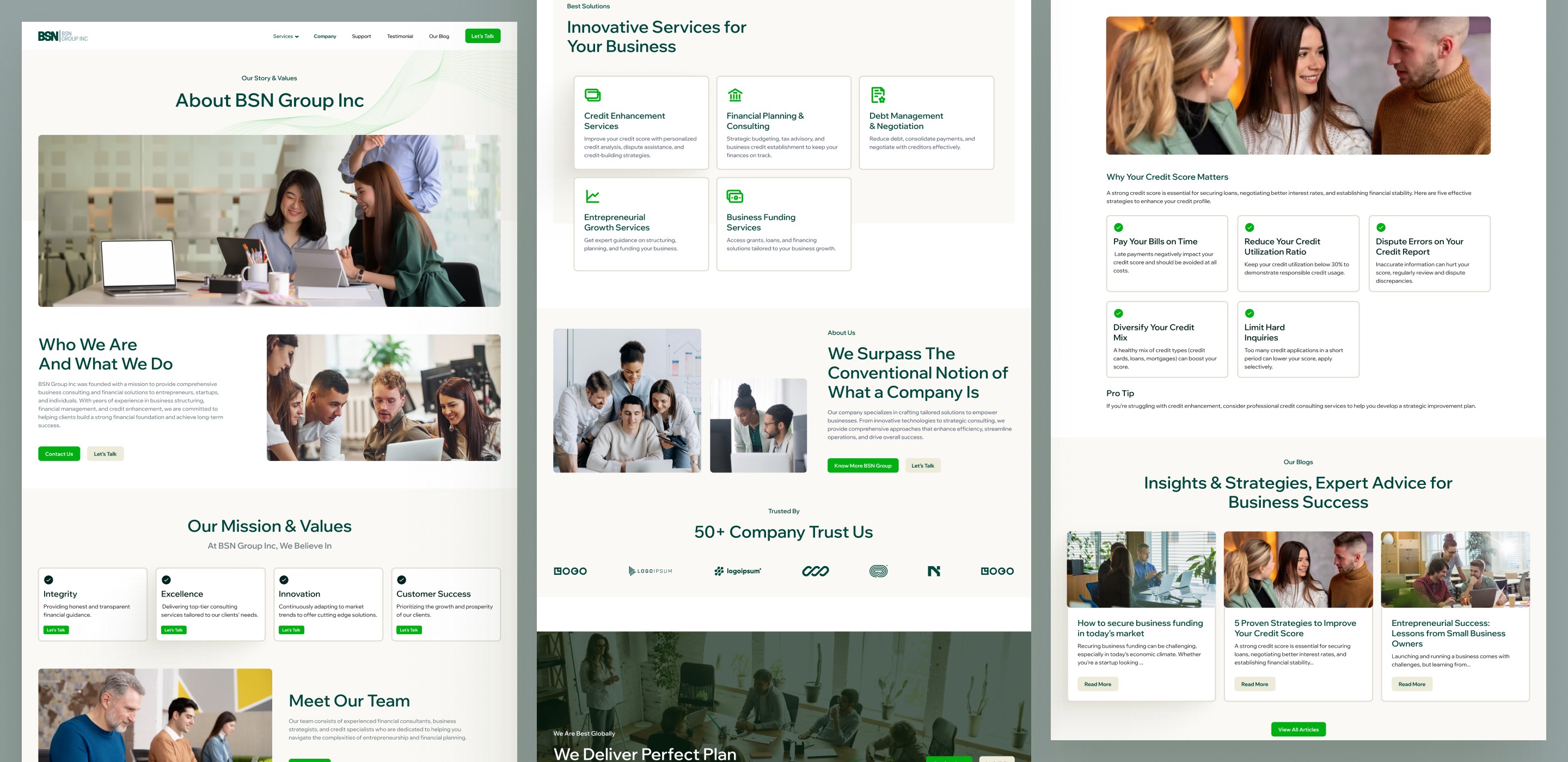 The result is a responsive, professional website that reflects the company’s mission—offering tailored business solutions with care and expertise. This design not only supports user trust but also positions BSN Group Inc. as a dependable partner for businesses seeking growth and financial direction.