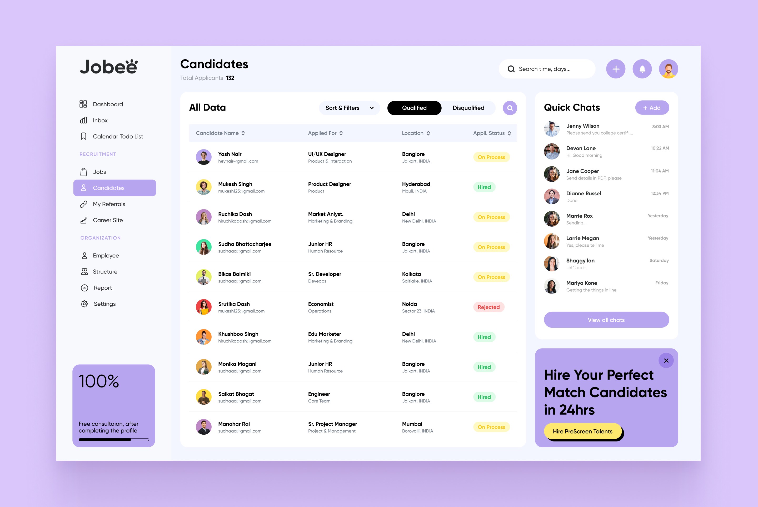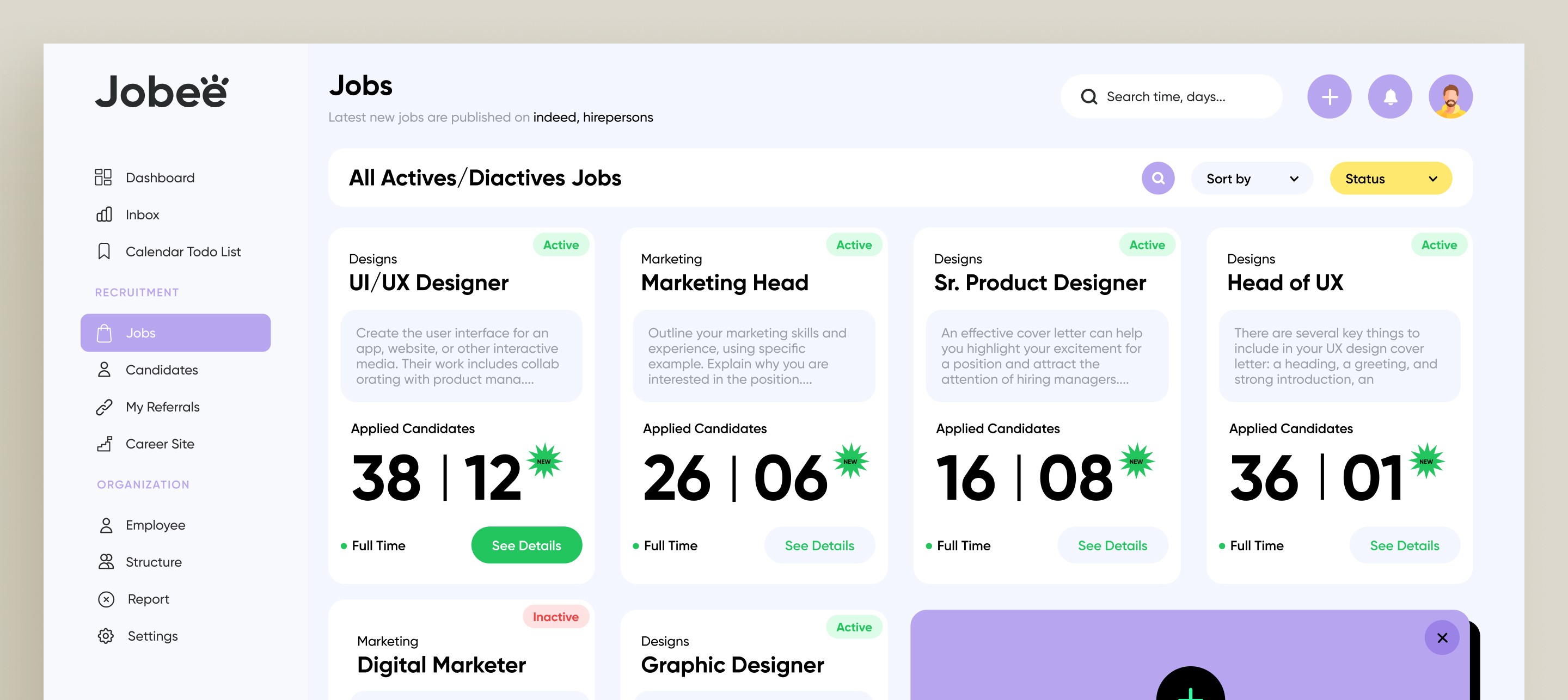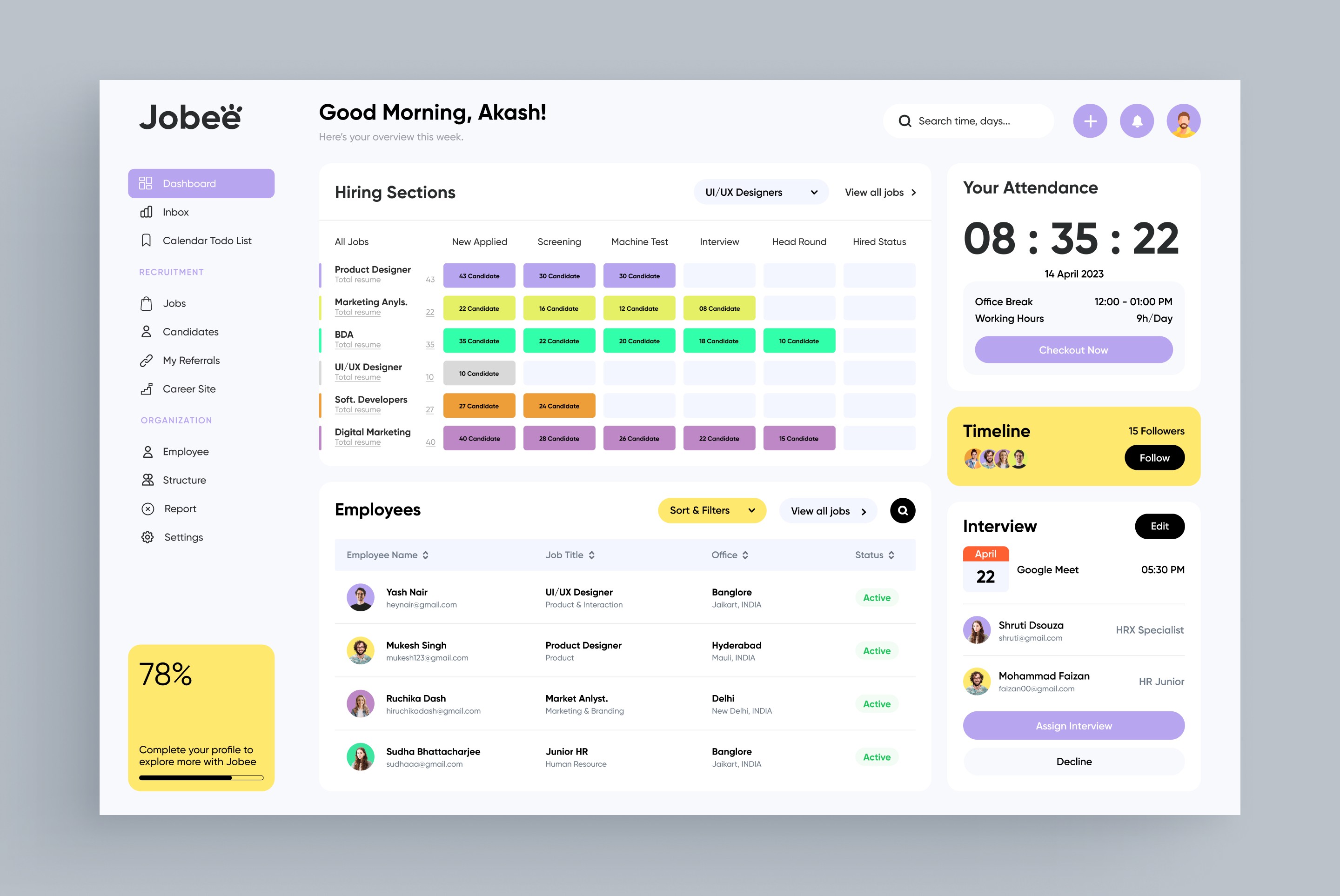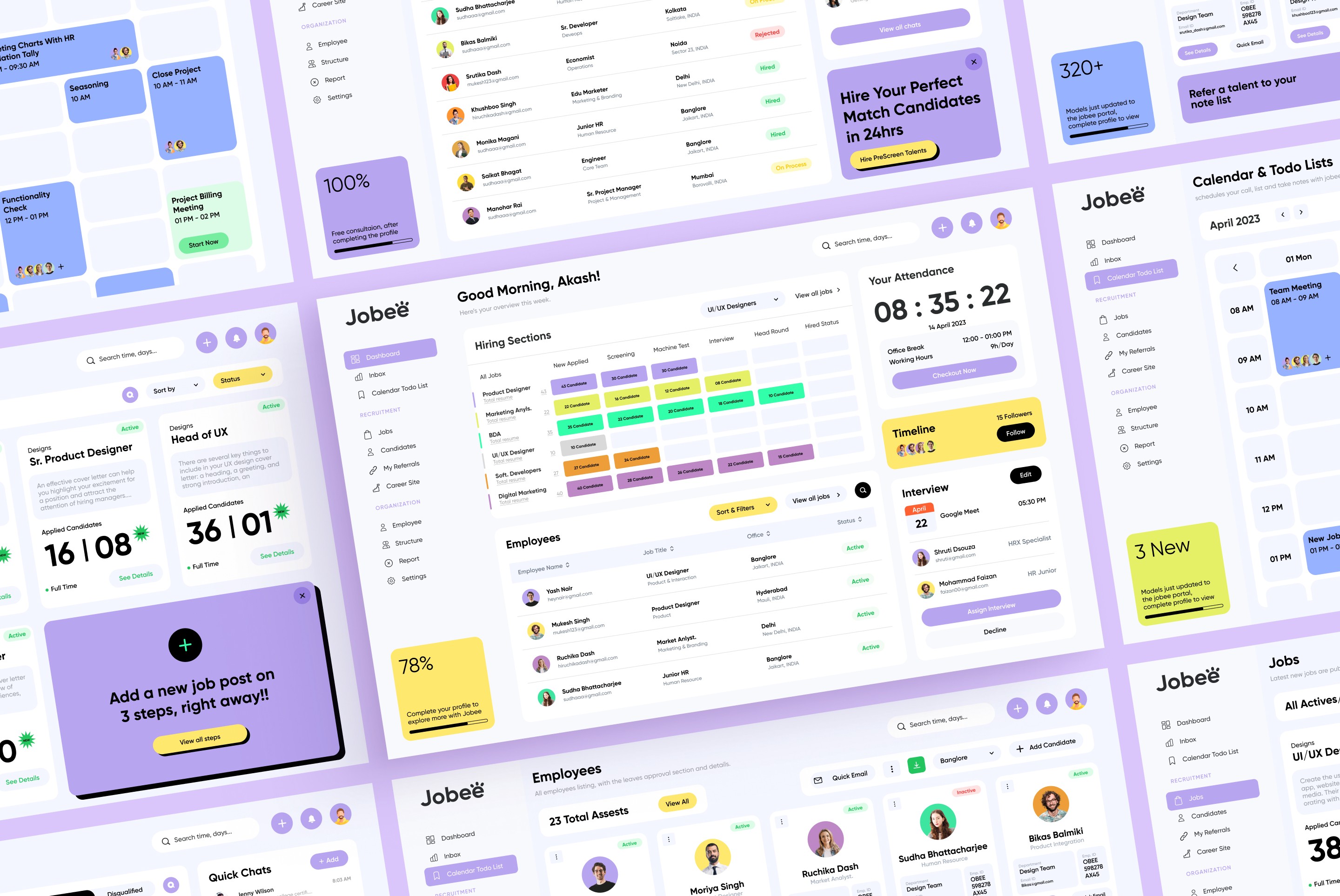 Designing the Jobee HR management platform involved several challenges. Balancing functionality with simplicity was key to ensuring the feature-rich interface—spanning calendars, candidates, employees, and jobs—remained intuitive and user-friendly. Maintaining a cohesive visual identity across modules while handling large volumes of data, such as employee details and attendance, required careful planning.